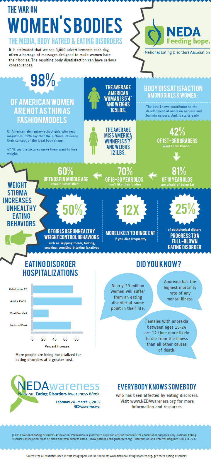 I found this informational infographic on the NEDA website. It’s unbelievable to read this information and see just how widespread eating disorders are in this country. More so, it’s incredible to learn how misunderstood eating disorders are in the U.S. by those unaffected. But the truth is, everyone is impacted by the culture of negative body image and it’s time to change that. To join the fight against negative body image, disordered eating, and excessive exercising, visit the NEDA website.